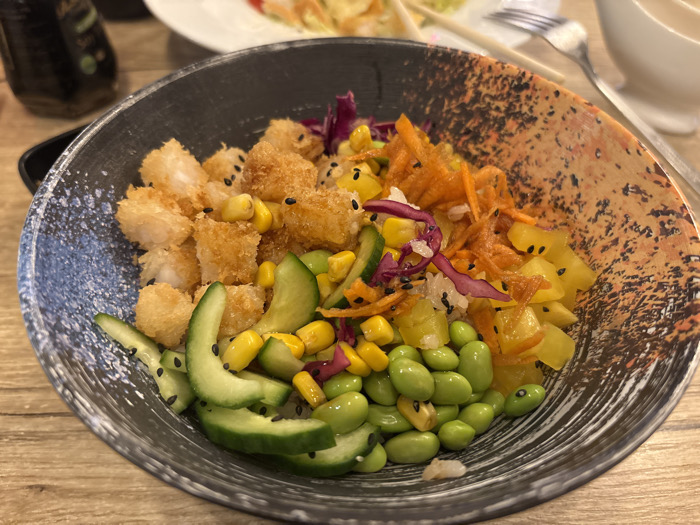A dark, speckled ceramic bowl occupies the center of the frame, presented on a light-colored wooden table. The bowl contains a diverse meal, arranged with various ingredients. On the upper left, there is a cluster of golden-brown, breaded, bite-sized pieces, possibly fried shrimp or chicken. To their right and extending into the lower portion, are bright yellow corn kernels, vibrant green edamame beans, and sliced green cucumber with black sesame seeds adhering to them. Further right, diced yellow fruit or vegetable, resembling mango or pineapple, is visible alongside shredded orange carrots and thin strips of purple cabbage or radicchio. White rice grains are present beneath and mixed with the other components. Black sesame seeds are scattered across several ingredients. In the blurred background, a dark bottle with a partial "Soy" label is visible on the upper left. On the upper right, an out-of-focus white ceramic dish, a silver fork, and chopsticks next to another dish with blurred food indicate a dining setting. The specific location within the city of Sliven, Bulgaria, cannot be determined from the provided visual information.