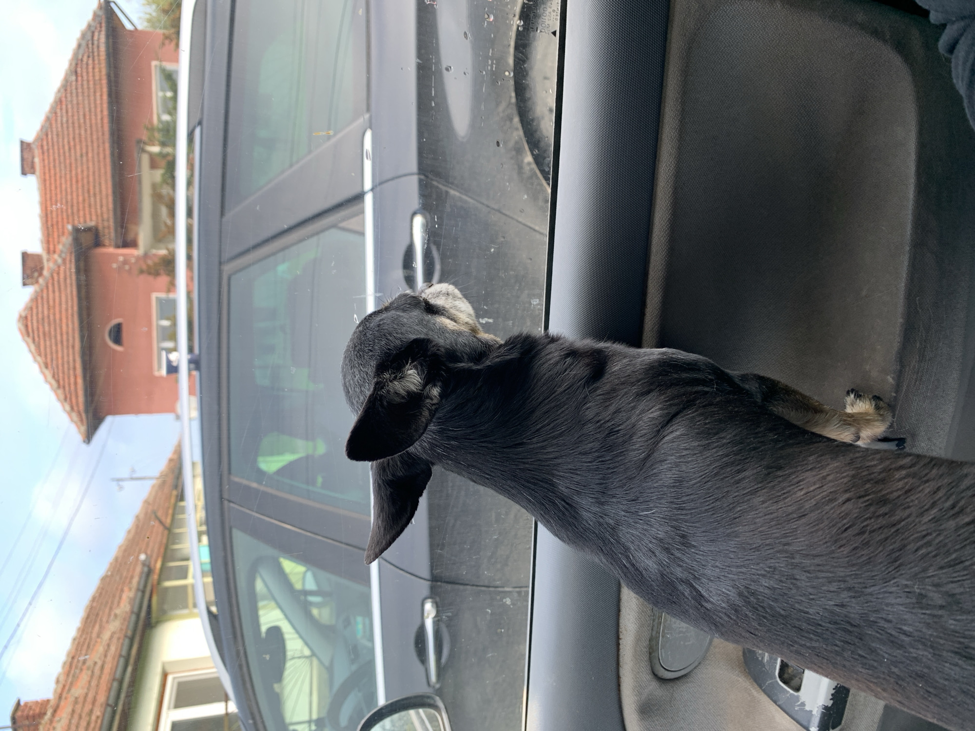 - "A small, dark-colored dog has its head extended outside the window of a gray car" by FM-CrvUt2, licensed under CC BY 4.0