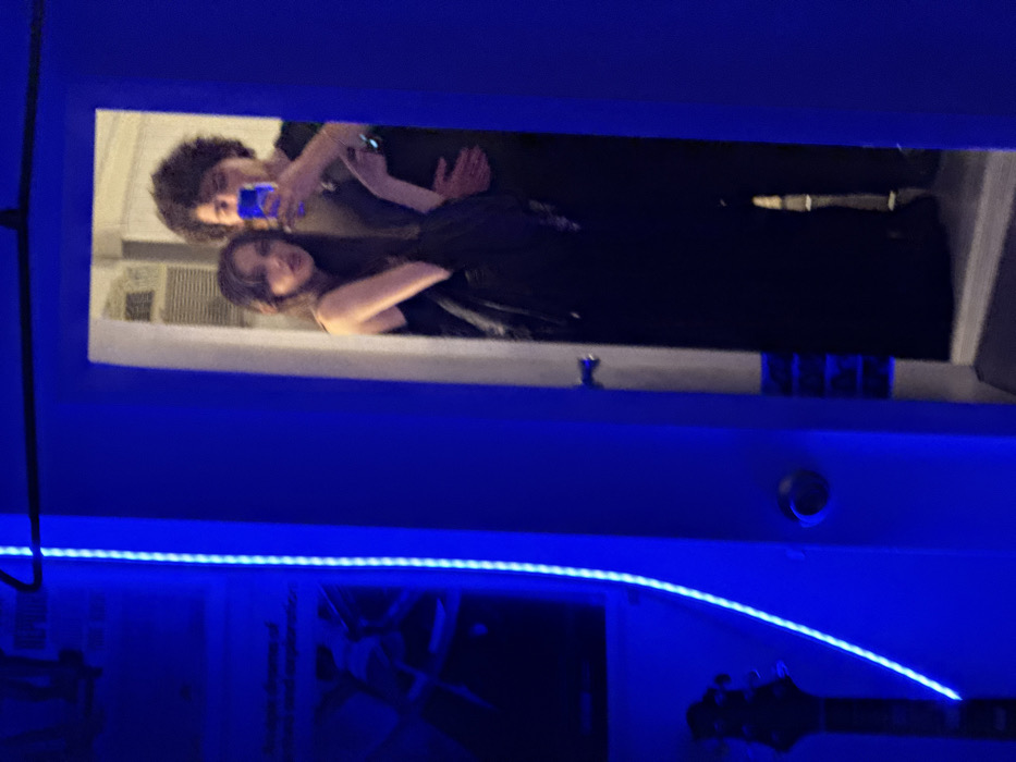 An indoor mirror selfie depicts two young adults in a room characterized by prominent blue LED lighting