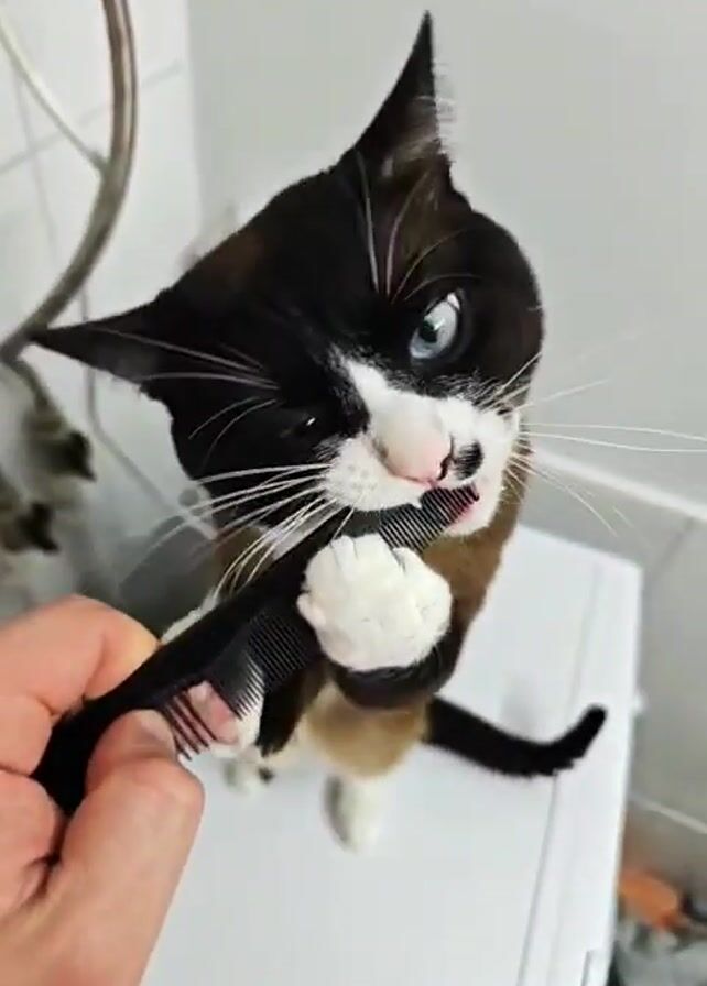 A handheld video shows a black and white cat playing with a comb