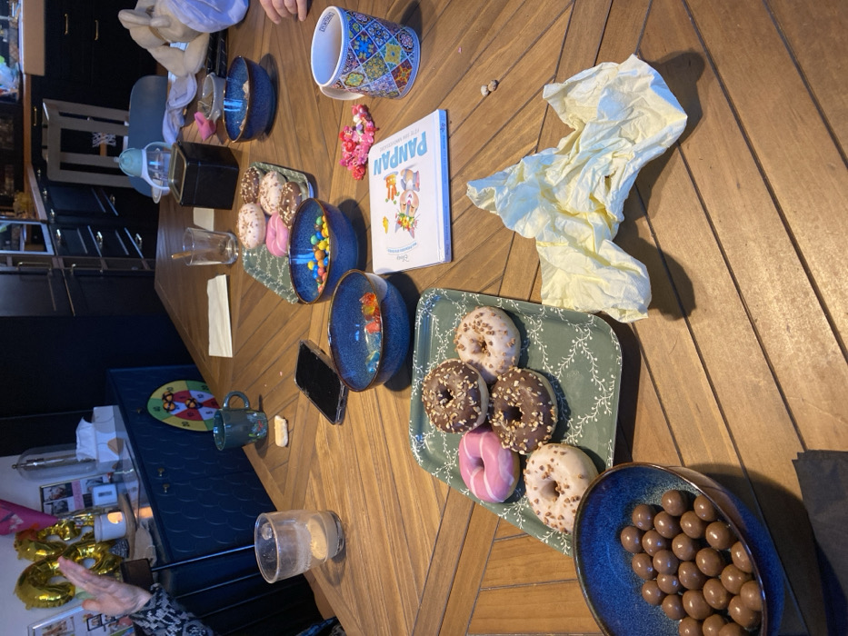 A high-angle interior shot depicts a wooden dining table with a herringbone pattern, located in a residential setting in Lys-lez-Lannoy, France. The table is laden with various food items and personal effects, suggesting a casual gathering. On the table, from left to right and foreground to background: A blue ceramic bowl containing numerous chocolate-coated malt balls is positioned in the lower-left. Adjacent to it, a green rectangular tray with a white foliage pattern holds five donuts: two light-colored with white sprinkles, two chocolate-frosted with chopped nuts, and one pink-frosted. A crumpled yellow paper napkin or towel lies to the right of the tray. Above the napkin, a small white paperback book titled "PANPAN" is visible. Near the book, a cluster of small pink and red flower-shaped candies is arranged, beside which rests a colorful patterned ceramic mug. Two small, light brown candy pellets are scattered near the crumpled napkin. Further up the table, a dark blue ceramic bowl contains colorful candy-coated chocolates, and another dark blue ceramic bowl holds various gummy candies. A black smartphone is laid on its side. To the right, a single light-colored cookie or biscuit is visible, near a dark green ceramic mug with a floral design. A clear glass with a light brown residue is present. Another green rectangular tray holds three donuts: two white-frosted with sprinkles and one pink-frosted. A black square container is situated next to a clear drinking glass containing a spoon. A white paper napkin is visible near the top right edge of the table. Regarding individuals, a left arm and hand, clad in a patterned sleeve, are visible gesturing upwards on the far left. The fingers of another person are partially visible on the far right edge of the table, near a white textile item, possibly a blanket or bag. The background reveals dark blue cabinetry, possibly part of a kitchen or dining area. A gold "20" balloon decoration is visible above the cabinetry on the left, alongside other small decorative items and framed pictures. A colorful dartboard is affixed to one of the cabinet doors. A high chair or child's seat, with a baby bottle, is partially visible in the far background on the right, suggesting the presence of a child.