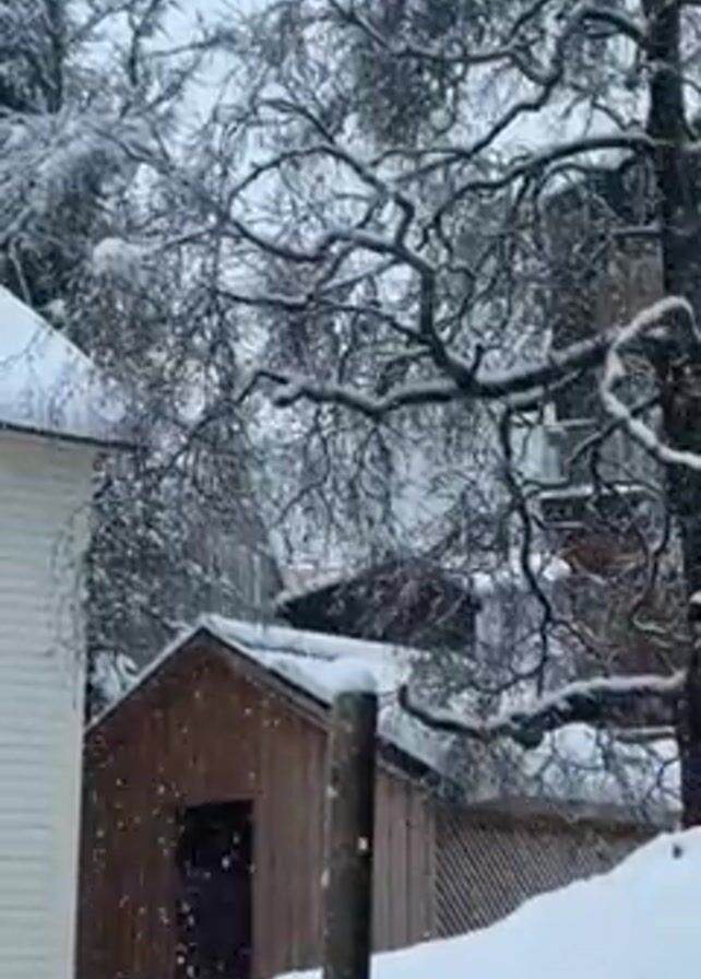 snowy scene with a small, wooden shed in the foreground and a white building to its left. A snow-covered tree stands prominently with its bare branches reaching up into the sky. Snowflakes are actively falling, adding to the existing layer of snow on the roofs and ground. The background contains glimpses of other buildings through the branches.
