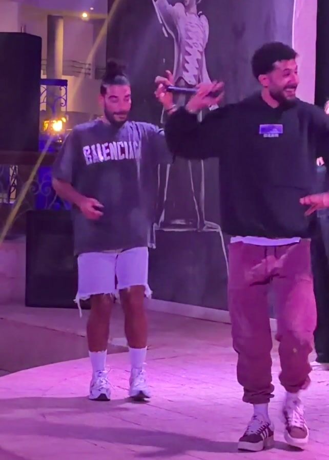 Two men stand on a pink stage and perform. The man on the left wears a gray t-shirt, white shorts, white socks, and white sneakers. His hair is pulled up in a bun. The man on the right wears a black hoodie, white t-shirt, burgundy pants, and black and white sneakers. He holds a microphone in his hand and sings. Behind them is a painting of a man in a suit. There is a large speaker on the left side of the stage. The stage is set up outdoors at night.