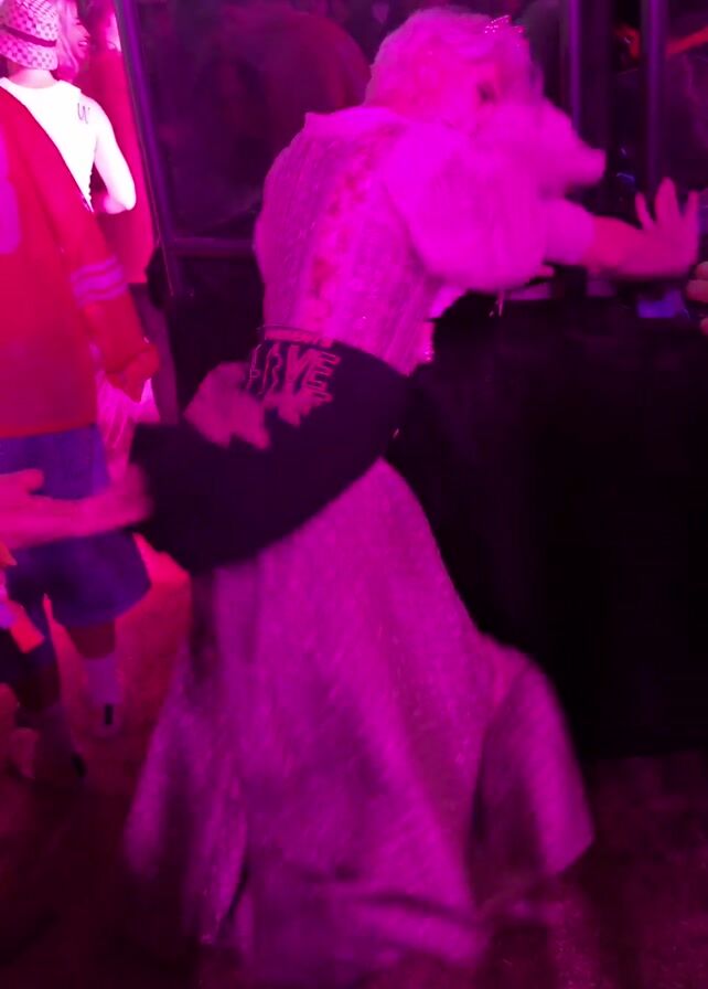 A person with short blonde hair, wearing a crown, light-colored frilly shirt, and a long dark skirt, dances in front of a large mirror at an outdoor music festival. Other people are visible in the background, some wearing red clothing and hats. The lighting is primarily pink.