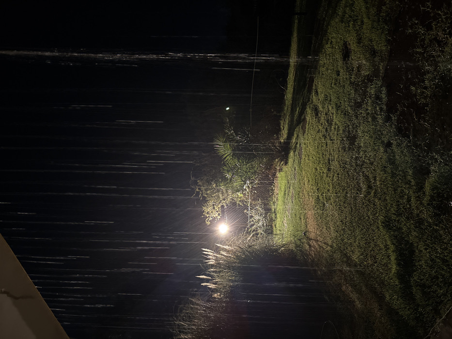 Night rain blurs a landscape with streaks of falling water. A bright light shines on tall grass and greenery behind a chain-link fence. Adjacent is dark grass. Power lines stretch across the top of the scene. A corner of a structure is visible on the bottom left. The overall mood is dark and wet.