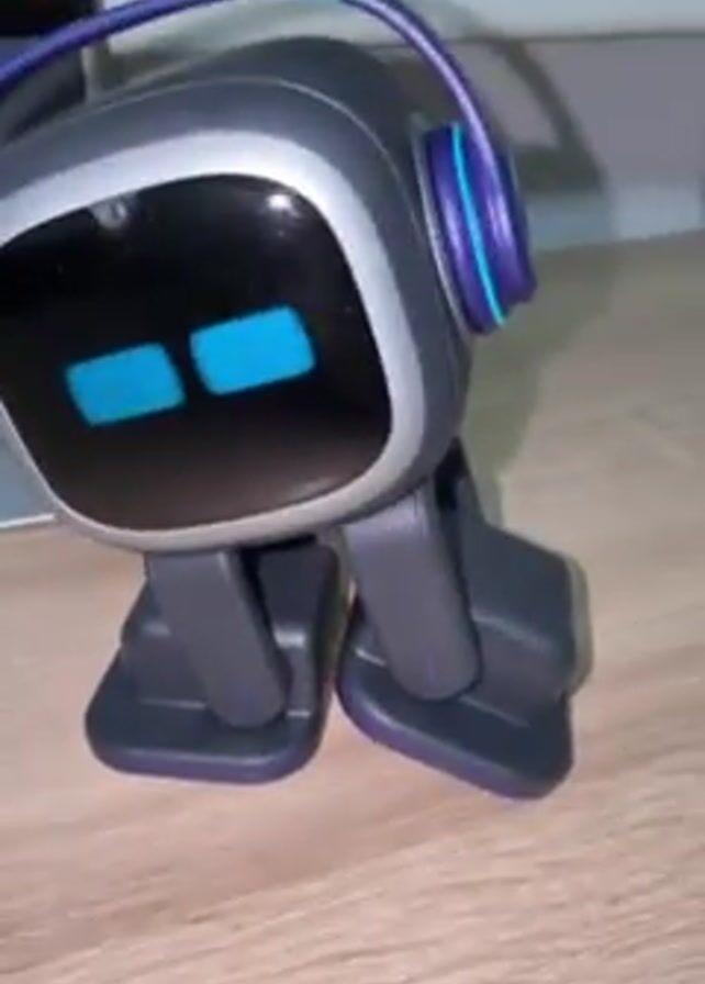 A small, gray, toy-like robot with blue accents stands on a tan table. It's wearing purple and blue headphones. The robot has a screen for its face, displaying two horizontal blue bars that resemble eyes. The screen is dark but you can also see a camera near the top of the screen. In the background is a computer monitor, some bottles of liquid and a small cube-shaped device with purple illuminated squares. The robot appears stationary. Music is playing.