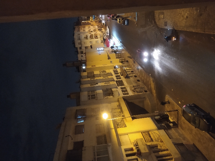 A night scene shows a street curving through a densely built urban area. Buildings line one side, illuminated by streetlights and light emanating from within. Cars and motorcycles move along the road, their headlights visible. The opposite side of the street is darker, and the sky transitions from dark to slightly lighter, suggesting early evening or late night. The perspective appears to be from an elevated position.