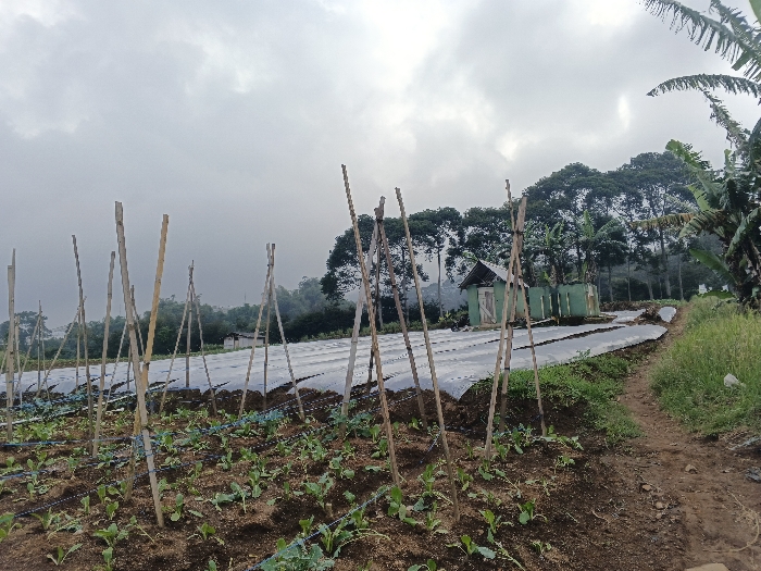 The image displays an agricultural field under an overcast, light grey sky, indicative of a rural or semi-rural area within or on the outskirts of Ho Chi Minh City, Vietnam. In the foreground, rows of young, green leafy plants, approximately 15-25 cm in height, are cultivated in dark brown soil. Numerous bamboo stakes, roughly 1-2 meters tall, are vertically embedded in the soil, some with visible drip irrigation lines attached. The mid-ground features several long, mounded rows of soil covered with white or light-colored plastic mulch sheets. Behind these mulched beds, a small, rustic wooden shed with a sloped roof and a light-colored wooden door is visible. To its immediate right, two smaller, light green-painted structures are present. The background consists of a dense treeline, featuring tall, slender trees and broad-leafed plants including what appear to be banana trees, suggesting a vegetated hillside. A dirt path runs along the right side of the cultivated land, sloping gently uphill. No individuals are present in the scene, which depicts an active farming environment.