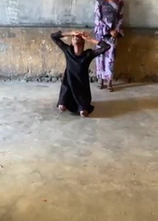 girl on her knees, with her head bowed and her hands over her face. She is wearing a long black dress. Behind her, a woman in a purple and white patterned dress and headwrap stands watching. They are in what appears to be a classroom, with a chalkboard behind them covered with writing. The floor is concrete and somewhat dirty.