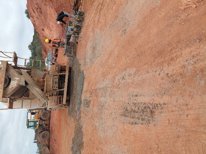 The scene depicts an active construction or materials testing site in Fdalate, Morocco, under an overcast sky