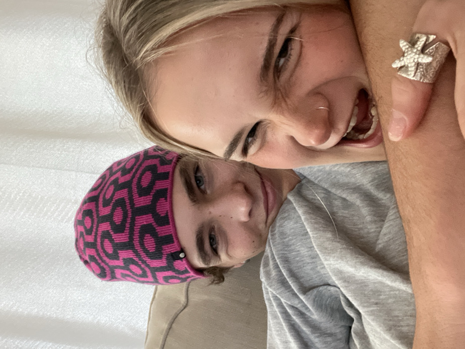 The image depicts two young individuals in an indoor setting in Kingston, Canada. A male subject is positioned on the left and slightly behind, wearing a pink and dark grey beanie with an interlocking geometric pattern, and a grey crew-neck sweatshirt. He has light eyes and a faint smile directed towards the viewer. A female subject occupies the right foreground, with blonde hair, a silver nose ring on her left nostril, and a silver starfish ring on her right ring finger. Her face is contorted in a playful grimace, with squinted eyes and an open mouth revealing teeth. Her right arm extends across the male subject's chest/shoulder area, indicating a close embrace or proximity. The background features beige upholstered furniture and a light-colored, possibly curtained or textured wall.