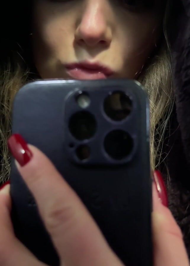 A woman with light skin, blonde hair, and red nails holds a black smartphone with a multiple-lens camera system up to her face. She wears a dark-colored, hooded garment. Her eyes are looking down at the screen of the phone. The background is dark. The woman's lips are slightly pursed, as if she is looking at her own reflection in the phone's screen.