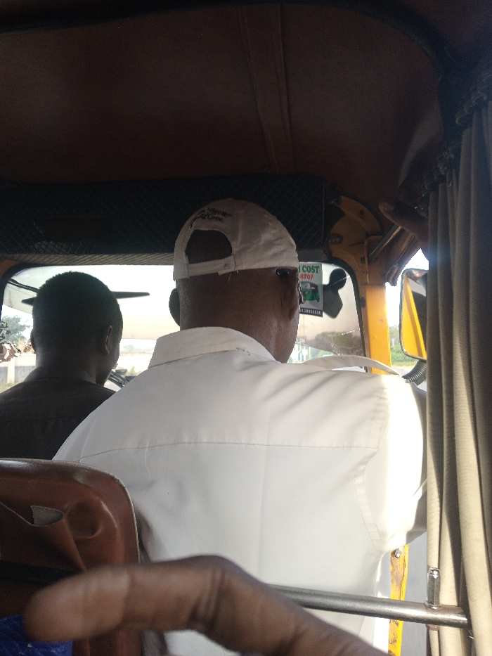 Inside a vehicle, possibly a taxi, two individuals are visible. The person in the foreground wears a white collared shirt and a white cap. The back of their head and shoulders are the main focus. In front of them, another individual with dark hair is seen from the back, presumably the driver. The interior of the vehicle is a combination of beige and brown tones. A curtain hangs on the side, and glimpses of the outside are visible through the windshield and windows.