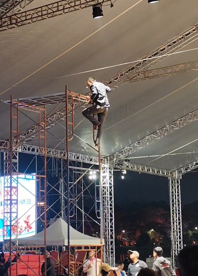 A person is standing atop a very tall, thin, metal pole that is attached to scaffolding. They are balancing on the pole, wearing a black jacket, grey pants and what appear to be red slippers. They hold onto the scaffolding for balance, and turn slowly. Below the scaffolding, there is a crowd of people, and a stage setup. A large banner is visible. The scene is taking place at night.