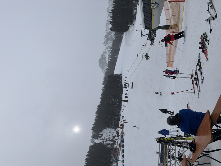 The image depicts an active ski resort on a cloudy winter day in Schwendau, Austria, characterized by a snow-covered mountain landscape under an overcast sky with a visible sun halo. The foreground features a snow-covered patio area with multiple wooden picnic tables and benches. One individual, wearing a blue jacket, is seated at a table with their back to the camera, observing the ski slope. Adjacent to the tables, several pairs of skis and ski poles are upright in a rack and laid flat on the snow. In the midground, a wide, groomed ski slope descends from left to right. Numerous individuals, identified as skiers and snowboarders, are present on the slope. Some are actively skiing downhill, while others are static or conversing. A prominent chairlift system traverses the scene, with several chairs, some occupied by passengers, ascending the mountain. The lower station of the chairlift, partially visible on the right, features a building with a "Mayrhofner" logo. A skier in a red jacket is navigating towards this station. Orange safety netting delineates areas on the slope near the chairlift. Further up the mountain on the left, a multi-story building with a brown roof and blue railings is visible, potentially a restaurant or ski school, indicated by a partially legible sign "SPORT SCHIEST... SNOWBOARDSCHULE RAMSAU." Dense evergreen forests cover the mountainous terrain, particularly on the left and extending across the background. Snow-dusted mountain peaks are visible in the far background. Light snowfall appears to be occurring.