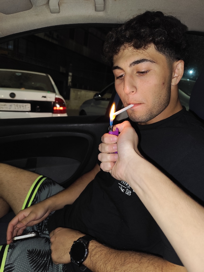 The image captures a nighttime scene inside a vehicle in As-Salihiya Municipality, Damascus, Syria. A young male with dark, curly hair and stubble is featured prominently, holding an unlit cigarette in his mouth. A second individual's hand is visible, holding a purple plastic lighter with an active flame, positioned to light the cigarette. This individual's forearm is partially visible, wearing a black t-shirt with a white "NIKE SB" logo. In the lower left quadrant, the legs and left arm of a third individual are discernible; they are wearing grey and black patterned shorts with a neon green stripe and a black smartwatch on their wrist. A white smartphone rests on their lap. Through the vehicle's window, a white sedan with a Syrian license plate reading "797747 دمشق" (Damascus) is parked in the background, with another darker vehicle partially visible beyond it.