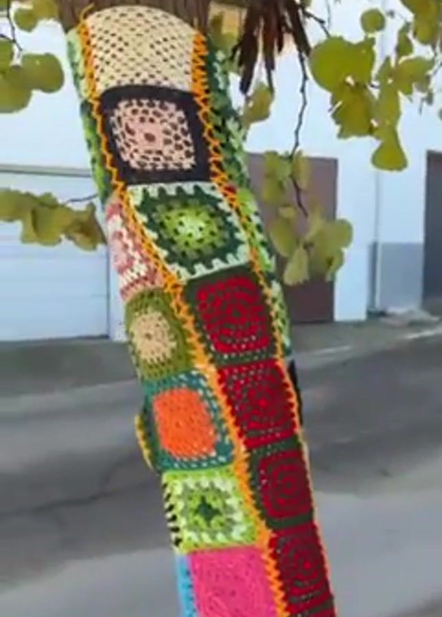 The camera pans upward on the trunk of a tree that is adorned with a multicolored crochet covering made of stitched-together granny squares