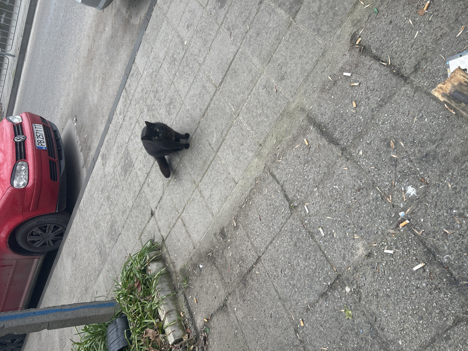The image depicts a street scene in Plovdiv, Bulgaria, identifiable by the "PB" prefix on the vehicle license plate. A black cat stands centrally on a grey tiled sidewalk, facing the camera with its tail slightly elevated. Behind the cat, a red Volkswagen Golf is parked parallel to the curb on an asphalt street; its Bulgarian license plate reads "PB 2571 TT." To the left of the cat, a concrete planter contains green foliage and a dark cylindrical object. The sidewalk surface is littered with numerous cigarette butts, dried leaves, and general debris. A grey post with a blue vertical stripe is visible on the far left, and a partial view of another light-colored vehicle is present on the right side of the street, behind the red car. A fragment of wood is visible in the bottom right corner of the frame.