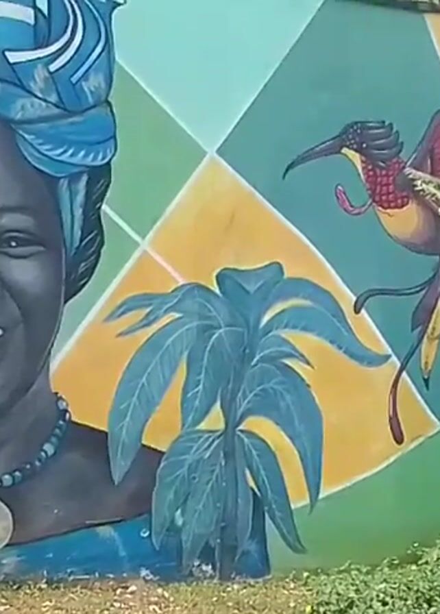 mural on a wall. The mural depicts a smiling woman wearing a blue headwrap and necklace, a tropical plant, and a colorful bird. A quote by Wangari Maathai is written on the wall: "The generation that destroys the environment is not the generation that pays the price. That is the problem." The mural is painted on a wall with a geometric background of green, yellow, and blue. There is some foliage in front of the wall. The video appears to be taken outdoors.