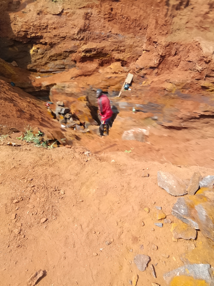 The image presents an outdoor scene in Ukwu-Abwa, Nigeria, characterized by a deep excavation or gully composed of reddish-brown, layered earth and rock. One male individual is centrally positioned within the lower section of the gully, facing left. He wears a red long-sleeved shirt and dark trousers or waders that appear to be soiled or wet below the knees. The man is holding a dark, elongated digging tool with both hands, directing its end towards the ground. To his immediate left, a pile of dark, angular rocks is visible. On the left slope of the gully, sparse patches of green vegetation are present. In the upper right background, a wooden plank leans against the reddish-brown rock face, with a dark, helmet-like object and other smaller items situated below it. Various small pieces of scattered debris, including blue, red, and white fragments, are distributed across the scene. The area is brightly illuminated by direct sunlight, creating distinct shadows.