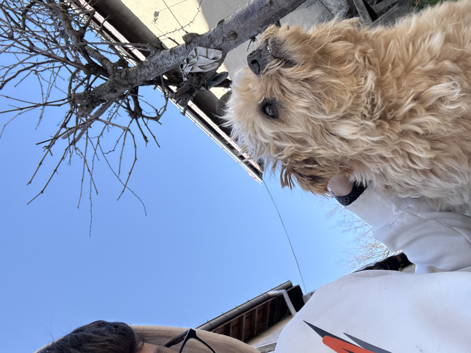 The image depicts an outdoor scene in Zavoya, Bulgaria, captured from a low angle looking upwards towards a clear, bright blue sky. A person is partially visible on the left, wearing a white long-sleeved top with a black and orange design and black-framed glasses. Their left hand, wearing a black wristband, is seen interacting with a light brown, shaggy-haired dog positioned centrally to the right. The dog, characterized by its dense, curly fur, has its head tilted upwards and slightly to the right, with its mouth slightly open showing teeth, and dark eyes. In the background, a bare deciduous tree with numerous branches extends into the sky on the right side; a light-colored fabric is caught on one of its lower branches. The eaves and guttering of two buildings are visible along the lower left and right edges of the frame, with a light-colored building wall apparent on the right. The absence of leaves on the tree suggests a colder season such as late autumn, winter, or early spring.