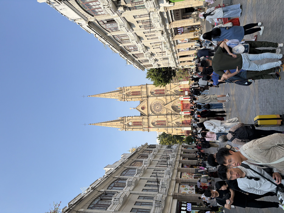 A church with two tall spires dominates the scene, surrounded by buildings with intricate facades. A large group of people, mostly wearing casual attire, crowd the plaza in front of the church. The sky is clear and blue. The image is rotated, with the sky appearing on the left and the ground on the right.