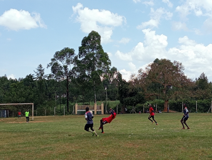 The image depicts an outdoor football (soccer) match or practice in Chevaywa ward, Kenya, on a grassy field under a partly cloudy sky