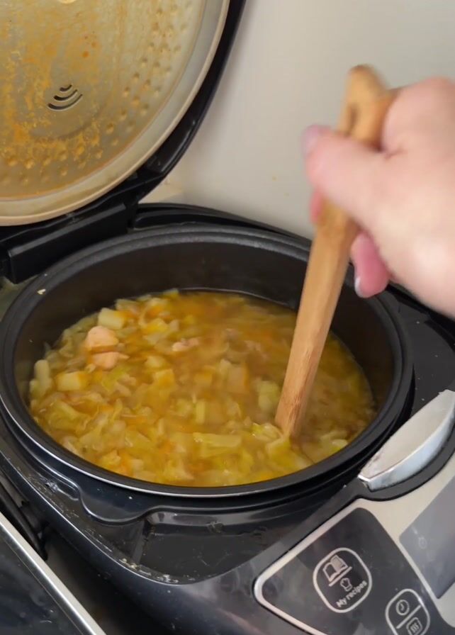The camera angle is a medium shot capturing the inside of a black multicooker, its lid propped open to reveal soup simmering within