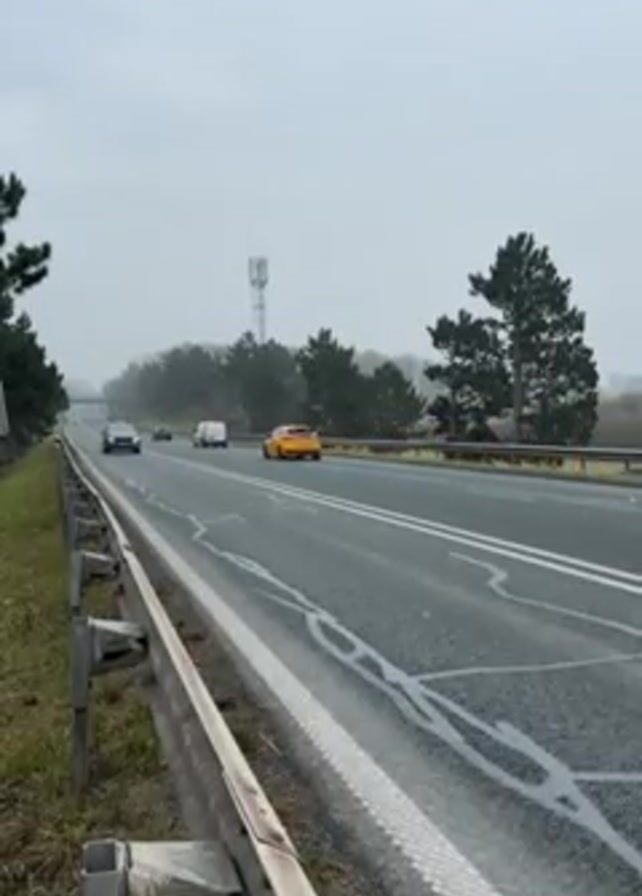 multi-lane road on a gray, overcast day, likely a highway. Several vehicles are traveling on the road, including a yellow car in the foreground, followed by a silver SUV, a white van, and other cars further down the road. The camera is positioned at the side of the road, behind a metal guardrail. Trees line the roadside, and a cell tower is visible in the distance. The road markings are faded and worn. There are no people visible in the video. The cars move from right to left in the frame. The general tone of the video is unremarkable and ordinary.
