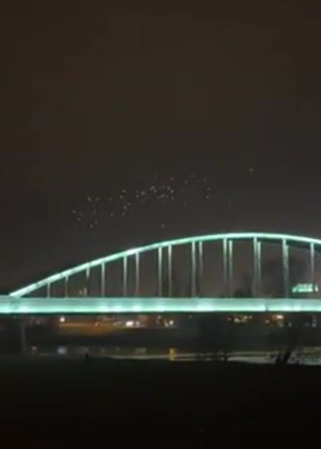 green-lit bridge at night. There's a flock of birds flying in the sky above it. The foreground is dark, showing a field or bank in silhouette. The bridge has an arch structure with vertical supports and lights running along its length. The sky is dark and cloudy.