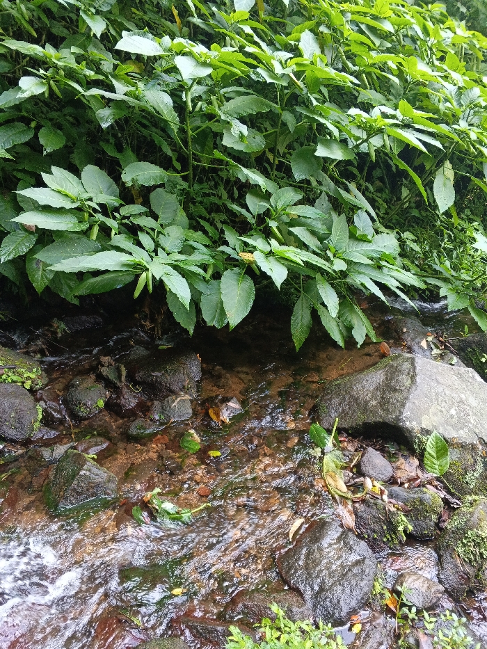 A small stream flows between rocks and lush greenery. Large, vibrant green leaves overhang the water's edge, providing shade. The water appears clear but carries a brownish tint, possibly from soil or decaying organic matter. The rocks are dark, some covered in moss, adding texture to the scene. A few fallen leaves rest in the water, swept along by the current.