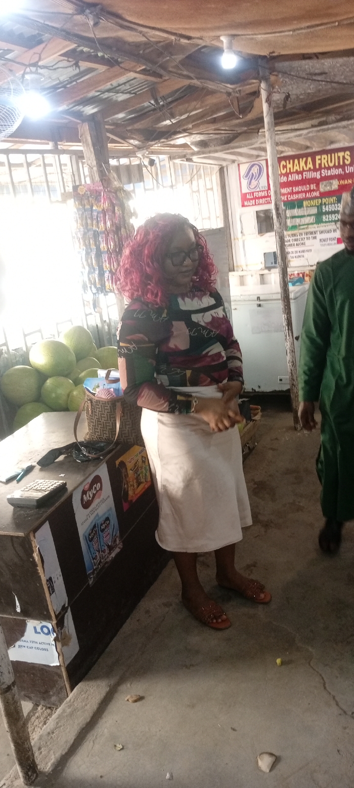 This image depicts the interior of a fruit stall or small shop within Tudun Wada, Nigeria, indicated by a partially visible sign for "CHAKA FRUITS" and "ALIKO FILLING STATION