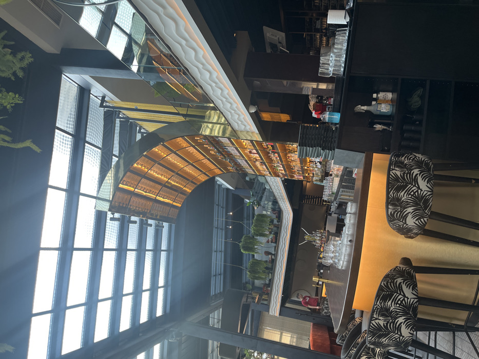 The image depicts the interior of Port Varna by The View, a multi-level bar and restaurant located in Varna, Bulgaria. The scene is dominated by a high ceiling featuring a grid-patterned glass skylight, allowing natural light to illuminate the space. A large, U-shaped bar with a golden-yellow illuminated base occupies the foreground and mid-ground. Several bar stools with black legs and seats upholstered in a black and white palm leaf pattern are positioned around the bar. The wooden bar top is clean, displaying rows of empty cocktail glasses and what appear to be bar tools or small ice buckets. Behind the main bar, bottles of spirits and mixers are arranged on shelving. A prominent feature is a massive, vertically curved, illuminated liquor shelf rising from the bar area towards the ceiling, densely stocked with various bottles. To the right of the bar, a black service station is visible, holding stacks of black plates, several bottles of cleaning solution (one blue, one white), and additional stacks of empty glassware. A roll of white paper towels is also present. One individual, wearing a red shirt, is partially visible in the mid-ground, positioned behind the bar on the left side. The upper level of the establishment is visible in the background, featuring a balcony with glass railings. The edge of this balcony is adorned with white, wavy, illuminated decorative panels. Hanging green plants are suspended from the upper level, contributing to the decor. Seating areas with tables and chairs are partially visible on this upper level.