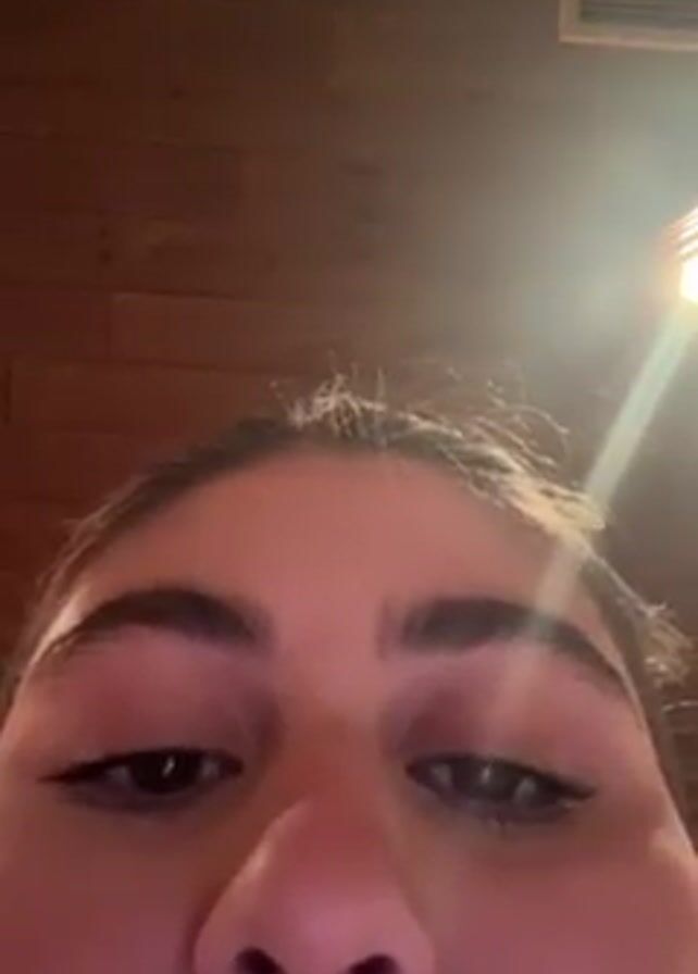 The video is a close-up shot of a person's face, specifically from the nose up. The person has dark brown eyes, brown eyebrows, and light skin. The background includes a wooden wall and a bright light fixture. The camera is positioned at a low angle, looking up at the person's face. The person's hair is pulled back from their face.