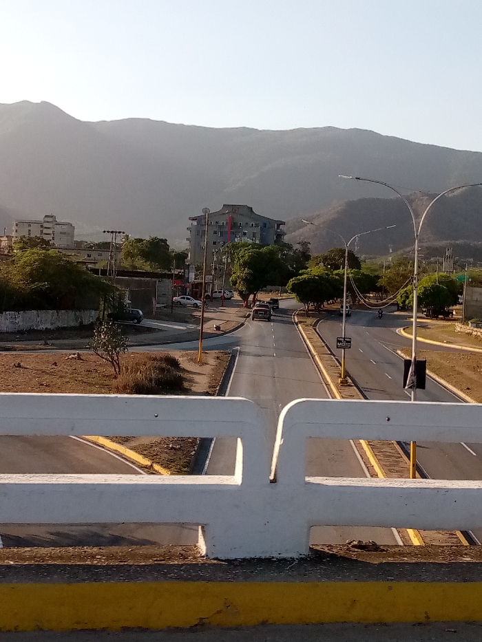 The image displays an elevated view of a road intersection and urban landscape in El Valle del Espíritu Santo, Venezuela, under clear daylight conditions, consistent with either morning or late afternoon