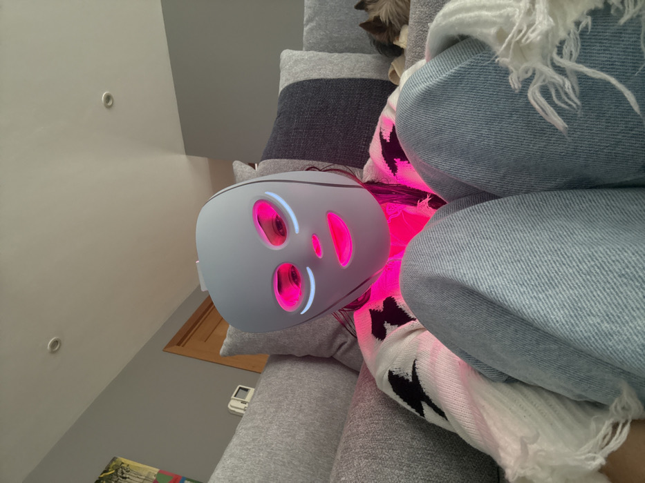 A person wears a glowing LED face mask, emitting bright pink light. The mask is pale gray and rests on a gray cushion. The person is wearing blue jeans and a white sweater with black lightning bolt patterns. Parts of the room are visible including the wall and ceiling with circular lights. The picture is rotated to the left.