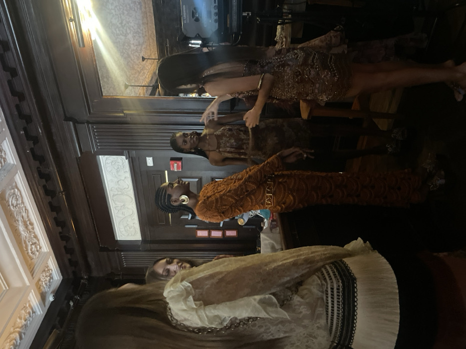 Four women are indoors. The first is wearing an elaborate white dress with black trim. Behind her stands a woman in an orange dress with a gold belt. Further back, there is another woman in a patterned dress, then one wearing a tan, sparkly mini dress. They appear to be at a fashion event, with rich wooden paneling visible in the background. A spotlight shines on the scene.