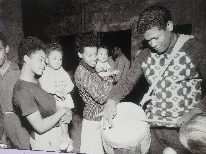A black and white photo depicts a group of people, likely family, gathered together. Two women each hold a child. One woman wears a striped shirt and light skirt, while the other wears a solid dark shirt and patterned skirt. A man in a patterned sweater plays a drum, focusing intently on his task. Another man stands slightly apart, wearing a collared shirt. The setting appears to be indoors, with a simple, possibly concrete, background.