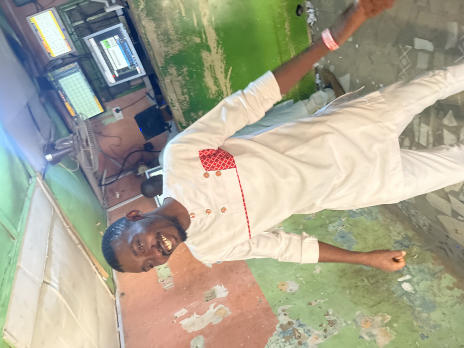 An indoor scene in Zaria, Nigeria, depicts a dark-haired male subject in a white long-sleeved tunic and matching trousers. The tunic features a red patterned breast pocket, a horizontal red stripe across the chest, and three gold-colored buttons on the placket. The subject has a short beard, a mustache, and is smiling broadly, revealing his teeth, while looking slightly to the left. A pink and white band is visible on his left wrist. The environment appears to be a functional space, possibly an office or control room. The walls are painted in peeling orange-brown and green hues, showing signs of wear and tear. A green-painted counter or desk spans the background. Above this counter, multiple computer monitors are visible, displaying various data sets and graphical interfaces. A dark-skinned individual is partially visible behind the counter, facing a monitor. A ceiling fan is mounted above and to the left of the main subject. The ceiling consists of light green paneling or stretched fabric, with visible support structures. The floor is covered with irregular, light-colored tiles.