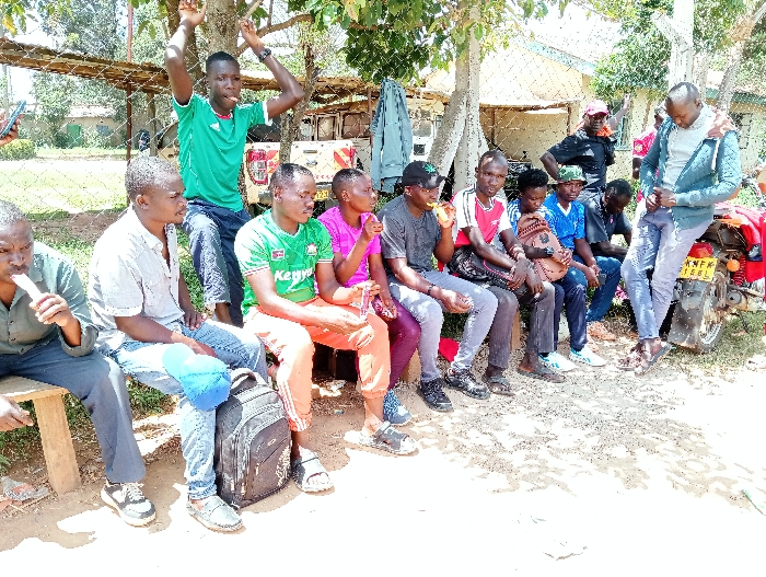 The image depicts an outdoor gathering of approximately fourteen individuals, predominantly young males, in Chevaywa ward, Kenya