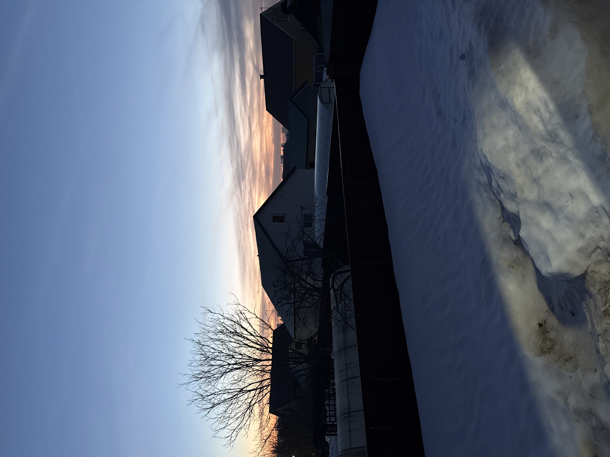 winter scene at dusk, likely in a residential area