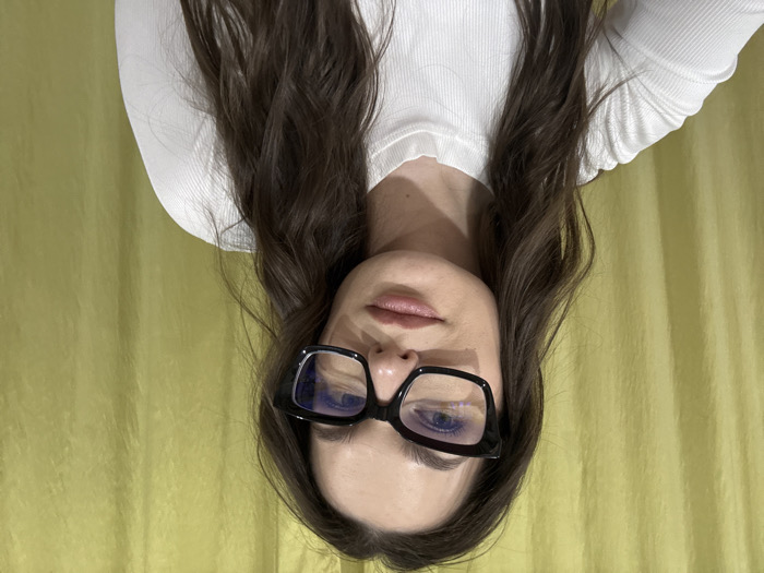 A woman is wearing a white, long-sleeved shirt and large, black-rimmed glasses. She has long, wavy brown hair. The background is a light yellow-green color. Her head is tilted slightly to the side.