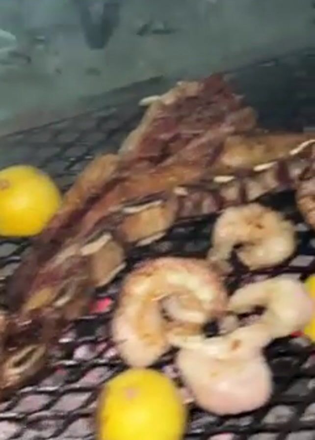 grill full of meat and lemons cooking over a charcoal fire. The camera circles around the grill, showing different angles of the food. A large cut of beef with ribs takes up most of the grill. The grill also contains a smaller piece of meat, several clusters of what appear to be grilled shrimp, and lemons, which are placed among the meat and shrimp. The food is sizzling and smoking as it cooks over the hot coals. The environment appears to be outdoors in a dark or dimly lit location, as the video is not very bright. A person can be heard speaking in the background.