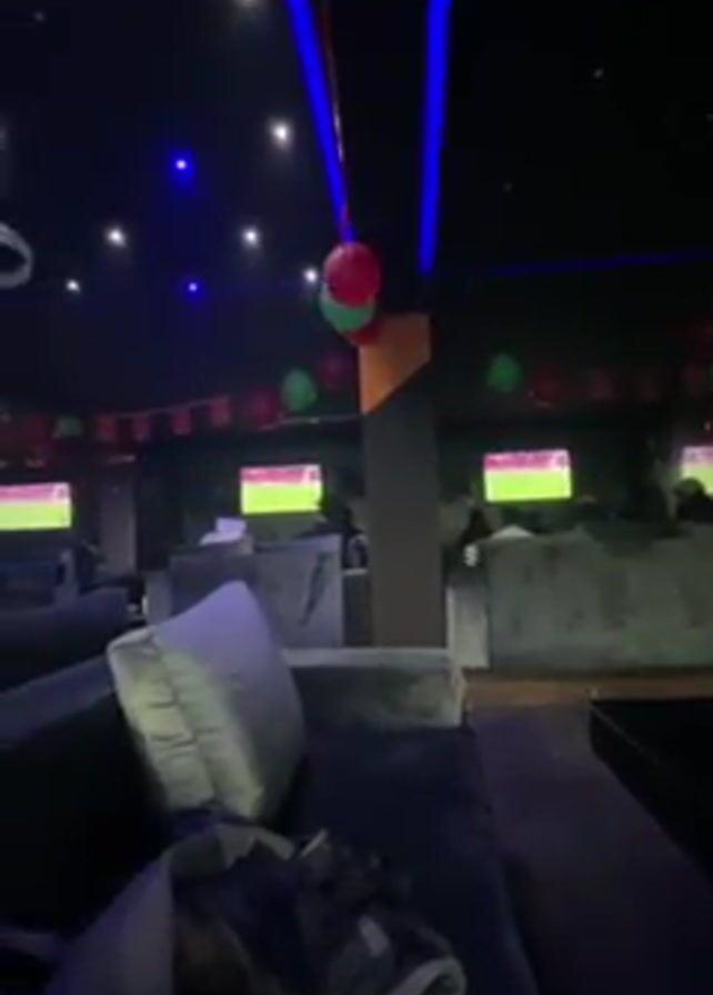 interior of a lounge or club, with a dark, nighttime atmosphere created by dark walls, flooring, and furniture. The lounge is decorated with strings of balloons in green, red, and possibly white colors, along with small flags. Several flat-screen televisions are mounted on the walls, displaying a soccer game. People are sitting in large, comfortable-looking cushioned seating areas, watching the screens. The ceiling is equipped with decorative lighting, including small recessed lights and blue LED strips, and a circular pendant light. The overall impression is that the space is designed for relaxed viewing of the game, with a focus on comfort and a celebratory ambiance.