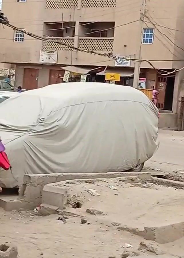 street scene in what appears to be an urban area. Several children are walking and running in the street. One little girl in a pink outfit is playing near a curb. In the background, a group of people dressed in red and green are walking, and a motorcycle and a yellow tricycle pass by. A large sign for "STAR" beer is visible on a pole. Buildings line the street, and several cars are parked, covered with car covers. The road surface appears to be dirt and sand.