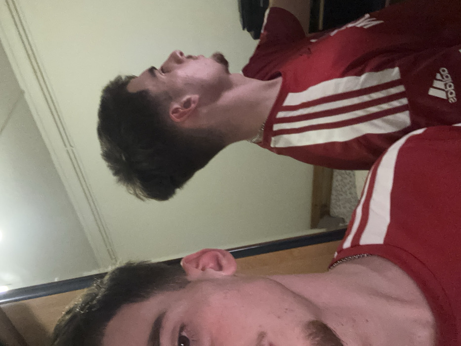 The selfie-style image captures a person in a red Adidas shirt with white stripes. Their face is partially visible in the foreground. A mirrored reflection reveals their upper body, face tilted upwards. The background includes a cream-colored wall and a dark object that might be furniture. The lighting seems artificial, contributing to the image's casual aesthetic.