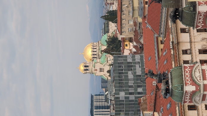 An elevated, long-range photograph depicts a panoramic view of Sofia, Bulgaria, under an overcast sky