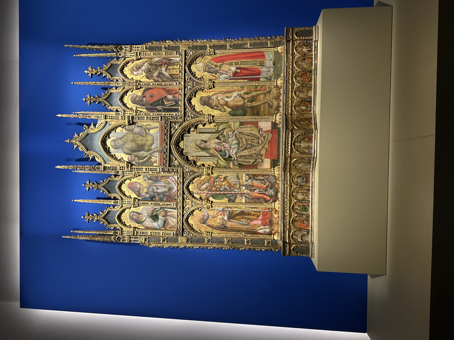 A vertical multi-panel altarpiece on display against a blue wall