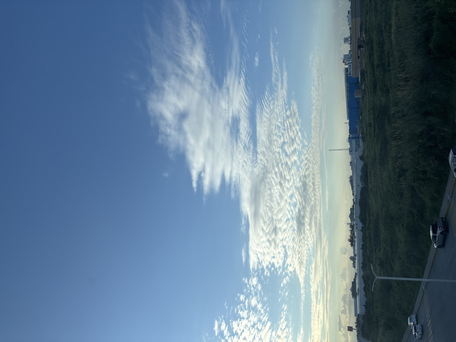 A serene blue sky filled with elongated, wispy white clouds dominates the view. These clouds transition into a patchier, more textured pattern towards the horizon. On the right side of the image, buildings and greenery blur into the background. A road and parked cars are visible in the foreground on the right, anchored by lampposts. The photograph is shot at an angle.