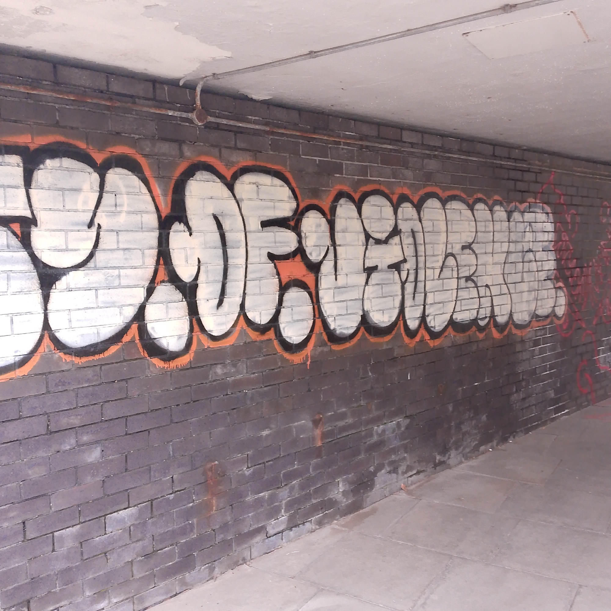This image captures a detailed section of the Hales Street underpass, also known as the Dehembre Subway, located in Coventry, United Kingdom. The scene is dominated by a dark grey brick wall spanning the lower two-thirds of the frame, extensively covered with graffiti. A large, multi-letter graffiti piece in a bubble-letter style occupies the upper half of the brick wall, primarily reading "SO DEHEMBRE". The letters are filled with an off-white or light grey paint, outlined in thick black, which is further encompassed by a distinct bright orange secondary outline. Several orange paint drips are visible extending downwards from the bottom edge of the letters. To the right of this main piece, faint red graffiti tags or outlines are discernible on the brickwork. The lower portion of the brick wall exhibits minor white efflorescence and some reddish-brown streaks, indicating possible moisture or rust. The ceiling, occupying the top third of the frame, is a flat, light grey concrete surface showing signs of wear, including minor flaking. Two metallic conduits run horizontally near the wall-ceiling junction: a lower, smaller pipe displaying rust, and an upper, larger, unrusted grey pipe. A rectangular access panel is visible on the ceiling towards the right side. The floor consists of light grey, square concrete paving slabs, appearing worn and with minor scuff marks and stains. The perspective is slightly upward, showcasing the wall, ceiling, and floor meeting in the enclosed underpass environment. No individuals, actions, or interactions are present in the scene.
